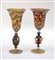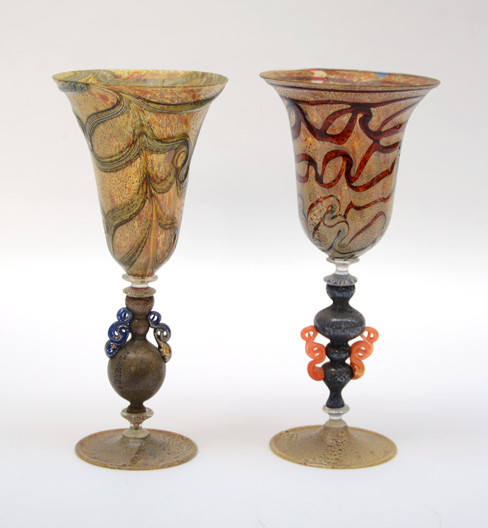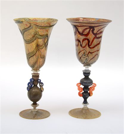 Manifattura di Murano del secolo XX coppia di grandi bicchieri a calice in vetro soffiato con decori policromi e applicazioni in pasta di vetro (h cm 25)