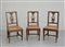 Tre sedie in noce con seduta impagliata schienale centrato da lira sormontata...