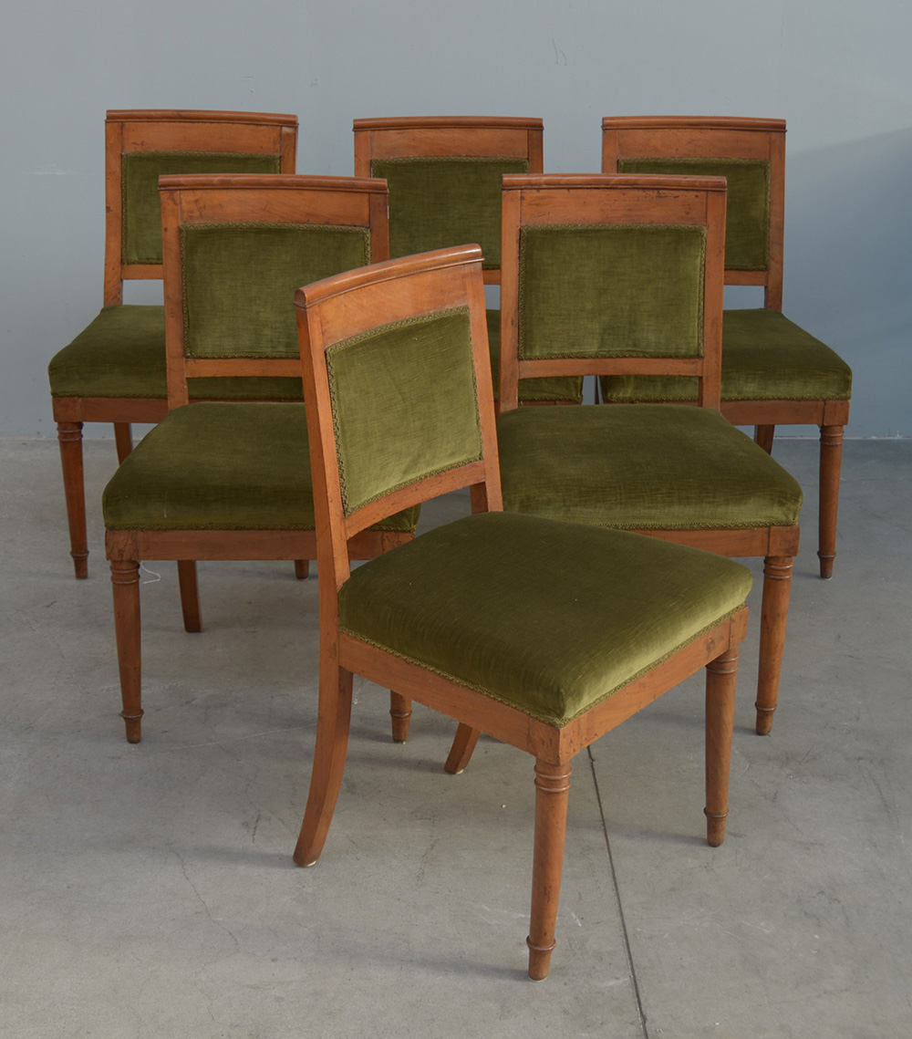 Lotto 1561 | Gruppo di sei sedie in ciliegio rivestite in velluto verde (difetti)