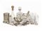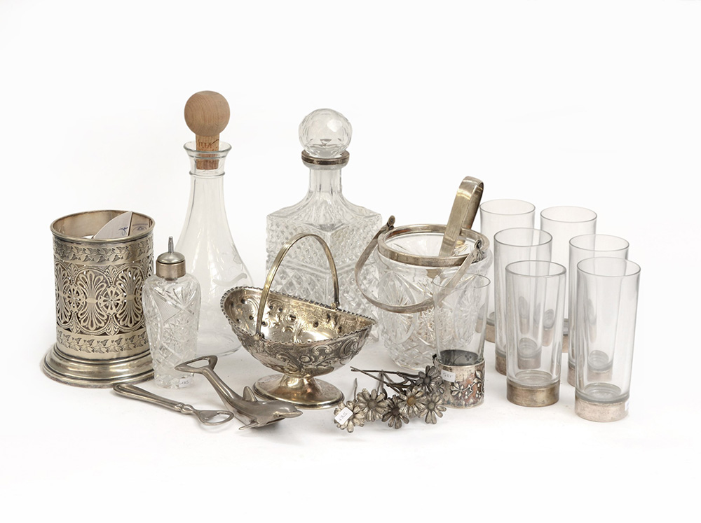 Lotto composto da un portaghiaccio con pinza, tre bottiglie con tappo, quattro bicchieri, un porta bottiglie, un cestino e otto oggetti diversi in vetro metallo argentato e argento (difetti)