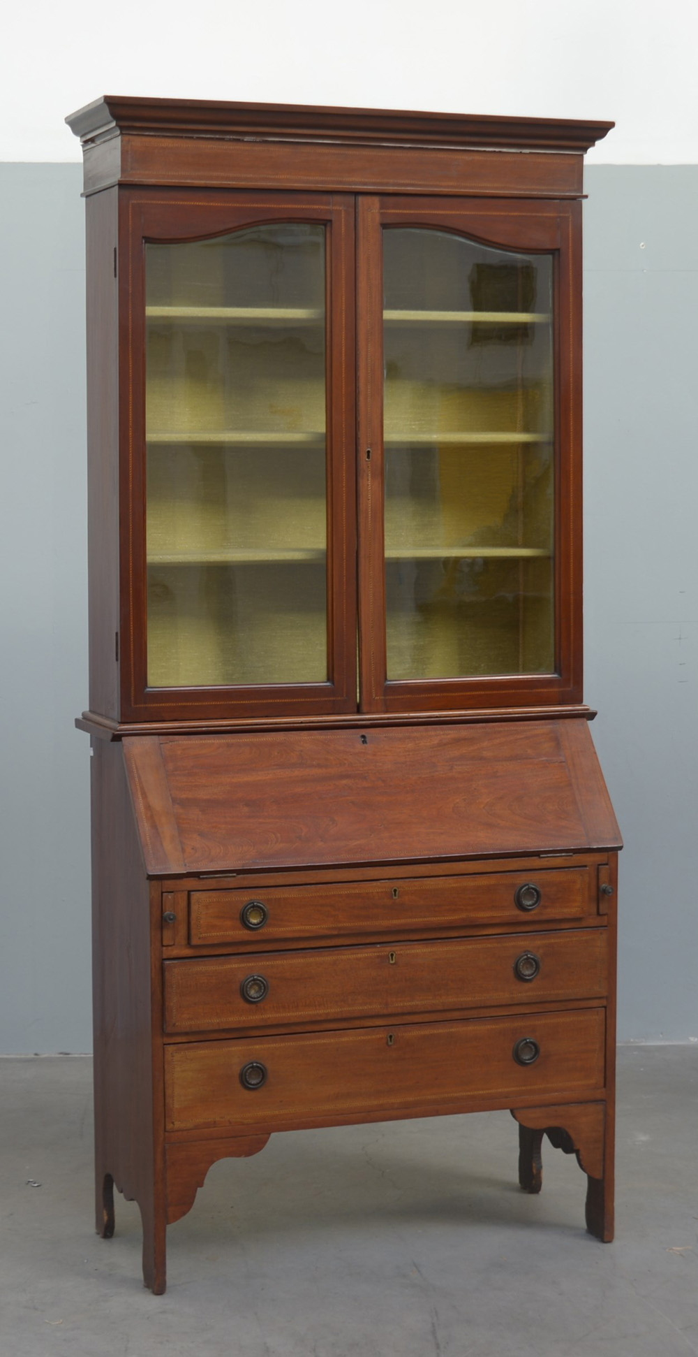 Mobile inglese a due corpi. Parte inferiore a ribalta con te cassetti, parte superiore con due ante a vetri (cm 95x200x42) (difetti)
