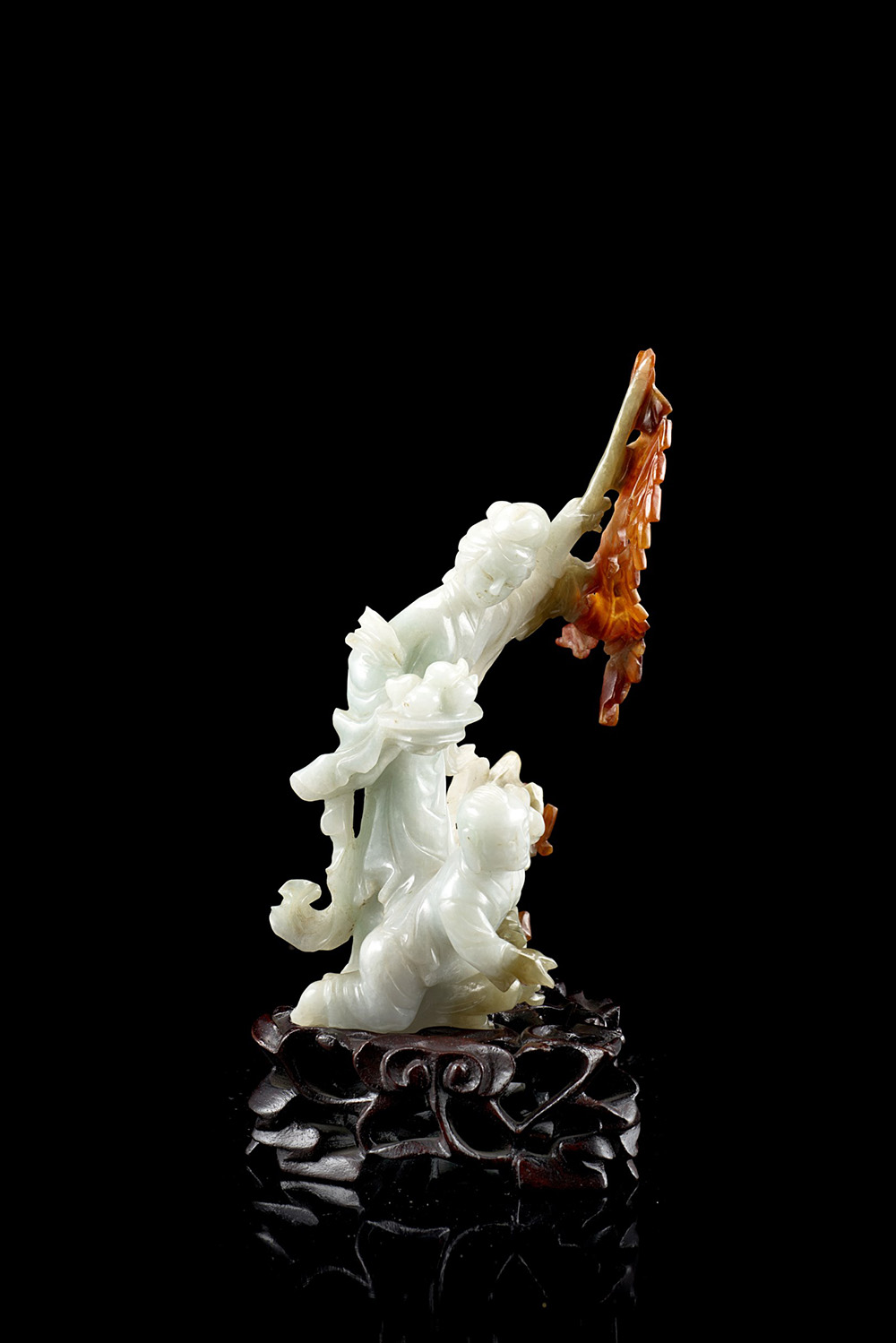 Piccola scultura in pietra dura nei toni celadon a ruggine raffigurante dama...