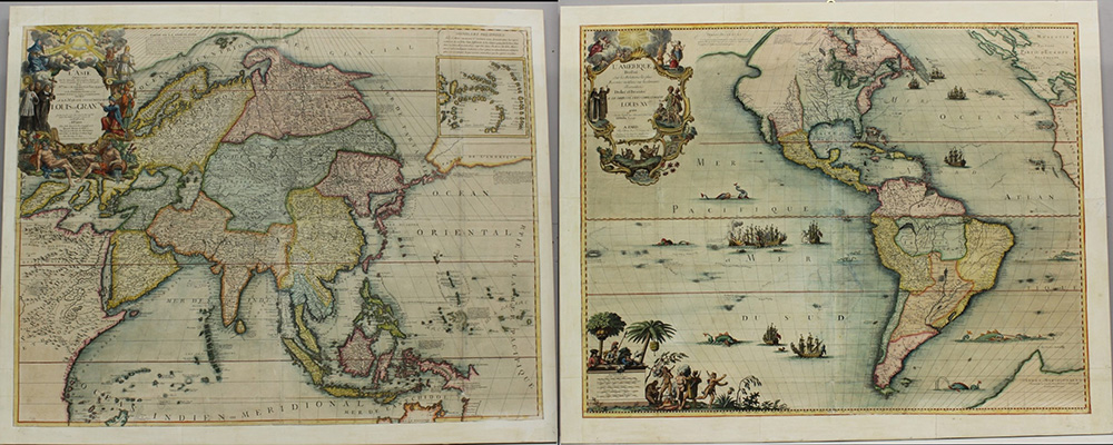 NOLIN, J.B. [Jean-Baptiste] - L'Asie Dressée sur les Nouvelles Observations Faites en toutes les Parties […] Mrs de l’Academie Roy.le Scien.ces […] ; L'Amerique Dressée sur les Relations les plus Recentes […]. Parigi. Due interessanti cartine geografiche a colori, foderate su telaio (carte cm86x109).