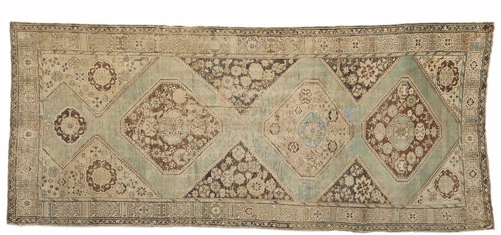 Tappeto Shirwan Kuba Caucaso inizio del sec. XIX, disegno a tre medaglioni su fondo azzurro nei toni cel rosa, nocciola e marrone (cm 360x150) (gravi difetti)