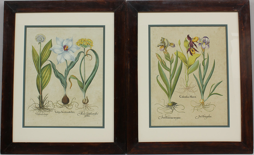 Coppia di tavole dipinte a tenui colori, presumibilmente tempere, da erbario (battuto cm 49x40). In cornici omogenee. (difetti)