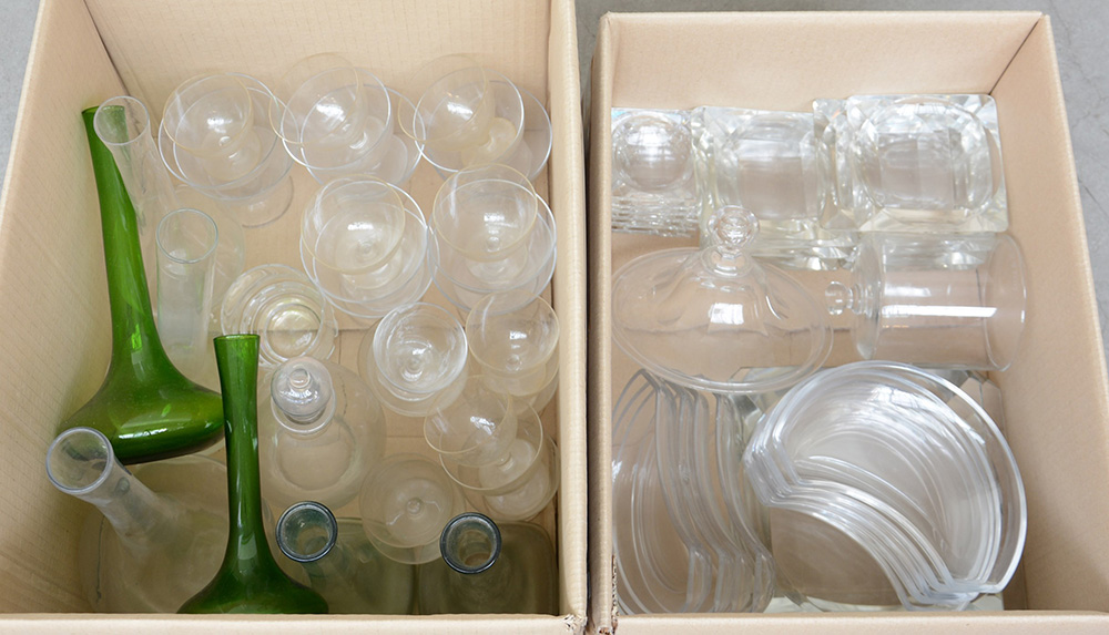 Lotto di due cartoni contenente numerosi oggetti in vetro fra cui bicchieri antipastiere e posaceneri (difetti)