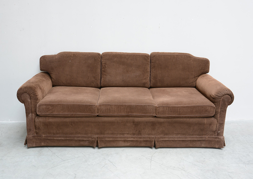 Divano a tre posti con schienale di soli cuscini rivesto con tessuto in velluto marrone (difetti)