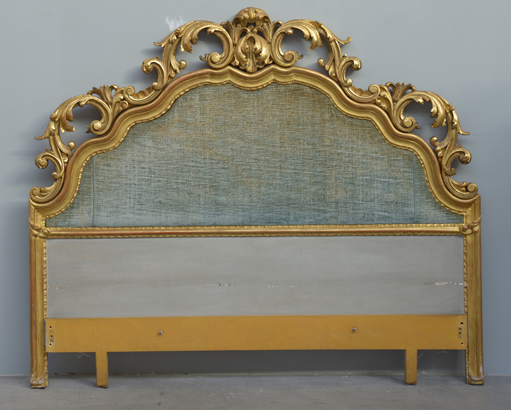 Letto in legno laccato e dorato con testata riccamente scolpita a volute e motivi vegetali