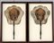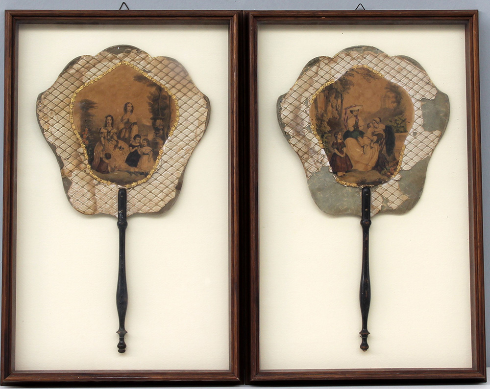 Coppia di ventagli con pagine in carta decorate con scene di vita quotidiana e prese in legno tornito ed abanizzato contenute in teche (difetti e mancanze)