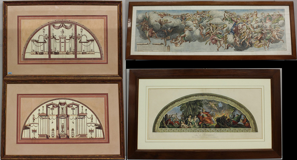 Gruppo di 4 incisioni a colori, entro cornice, di misure diverse (difetti). [Coppia di incisioni di lunette a tema architettonico, di gusto barocco - grottesco ; MASSE, J. B. (disegno di) - L'Allemagne, n. 46 ; VANNI, Gio B. ta (incisore) - scena celeste].