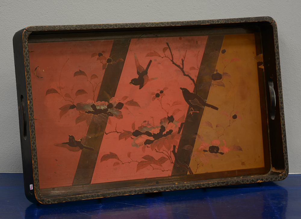 Vassoio biansato in lacca nera decorato in policromia con uccelli su rami fioriti, Giappone, sec XX (difetti)