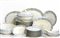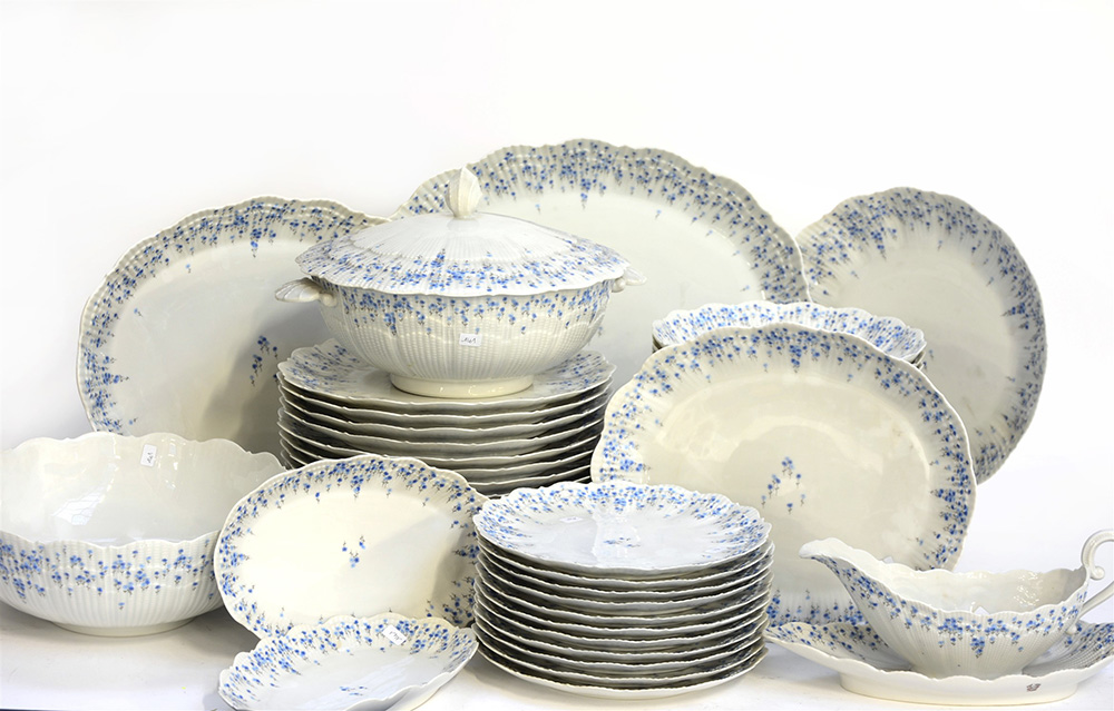 Manifattura francese Limoges, parte di servizio di piatti in porcellana composto da zuppiera con coperchio, 5 piatti da portata, 2 antipastiere , una insalatiera, una salsiera, 23 piatti piani, 9 piatti fondi piccoli e 11 piatti piani piccoli