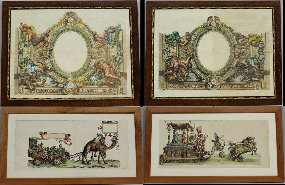 Due scene con carri effimeri, numerate 89/135 e 21 ; Due rappresentazioni di apparati decorativi. Due coppie di incisioni a colori, in coppia di cornici omogenee, di dimensioni diverse, raffiguranti scene di gusto pienamente barocco (difetti).