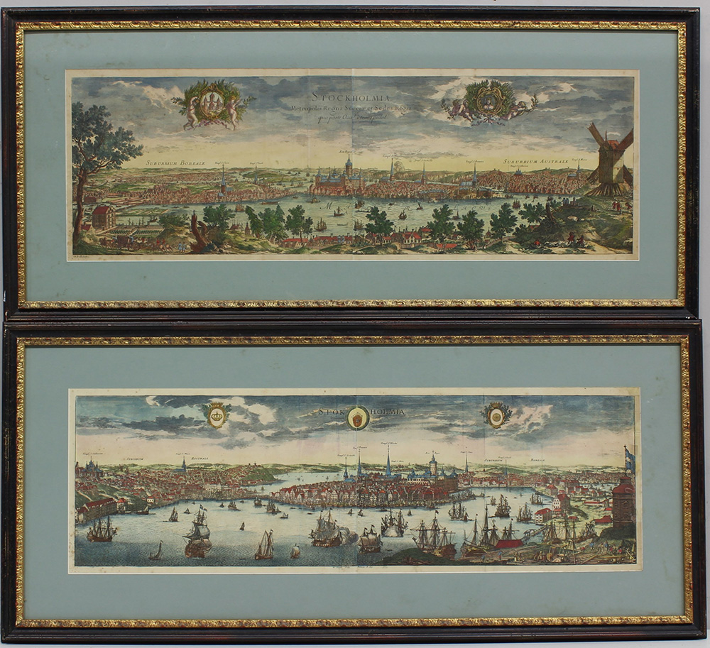 PERELLE, A. (scultore - incisore) - Coppia incisioni a colori di vedute di Stoccolma, di gusto sette - ottocentesco (disegno cm 25x78,5) (difetti). In cornici omogenee.