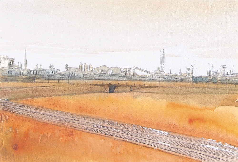 ALESSANDRO BUSCI Milano 1971 Fabbriche acquerello su carta cm. 17x25, sigla...