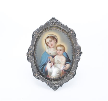 Placca ovale in porcellana dipinta in policromia raffigurante Madonna con bambino (cm 10x7,5)in cornice in argento cesellato (difetti)