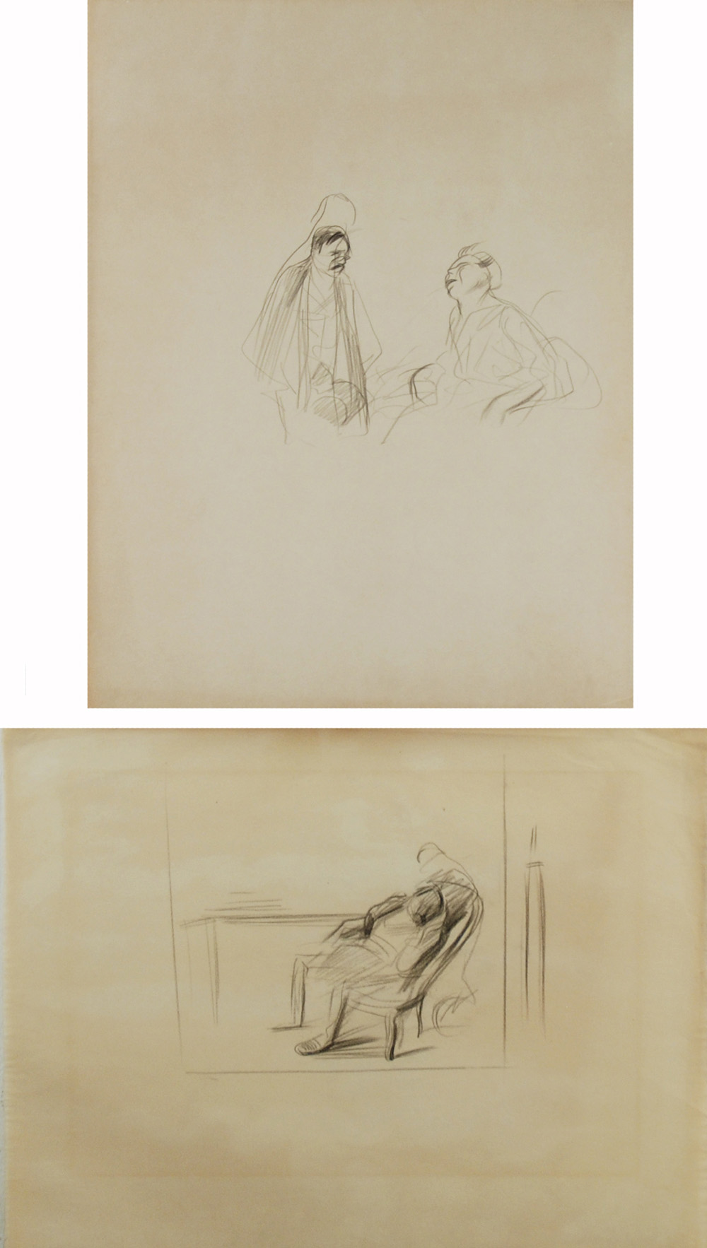 Coppia di disegni a matita raffiguranti degli studi per figure (cm 57x44)