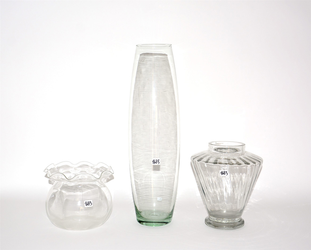 Lotto composto da tre vasi in vetro di forme e misure diverse
