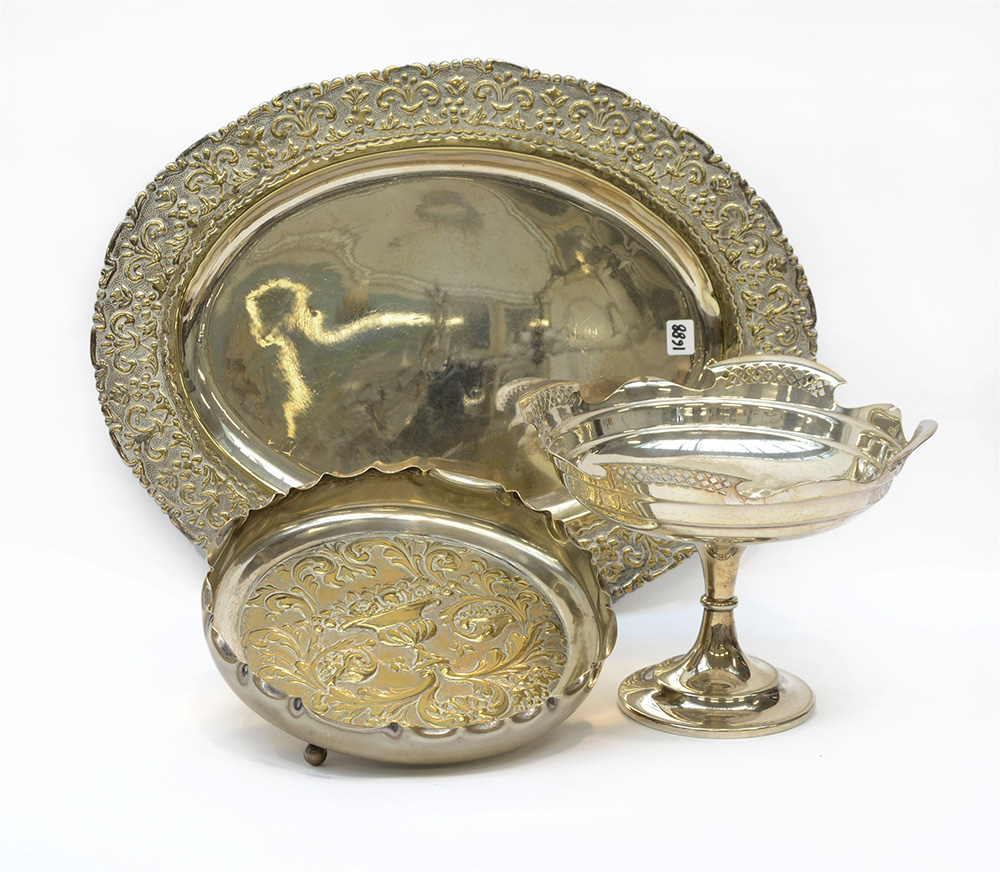 Lotto composto da un vassoio ovale, un'alzatina con bordo traforato e una ciotola in metallo e ottone