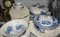 Manifattura inglese, servizio da tavola in ceramica decorata a paesaggi in monocromia blu composto da undici piatti piani, sei fondi, sei piattini da frutta e cinque coppette da macedonia con piattini, due zuppiere, due insalatiere e sei piatti da portata (difetti)