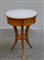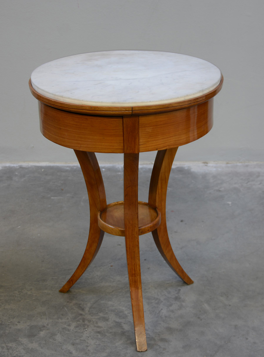 Tavolino tondo in ciliegio con piano in marmo ad un cassetto nella fascia, gambe sagomate riunite da pianetto. Inizio sec. XX (d cm 57x80)