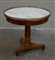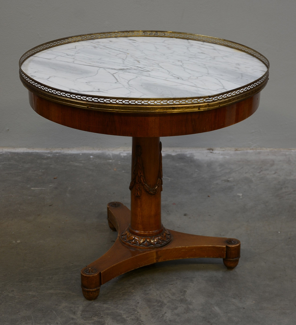 Tavolino tondo con piano in marmo e ringhierina in ottone traforato. Gamba centrale tornita e intagliata terminante a tre piedi sagoamti (d cm 70x66)
