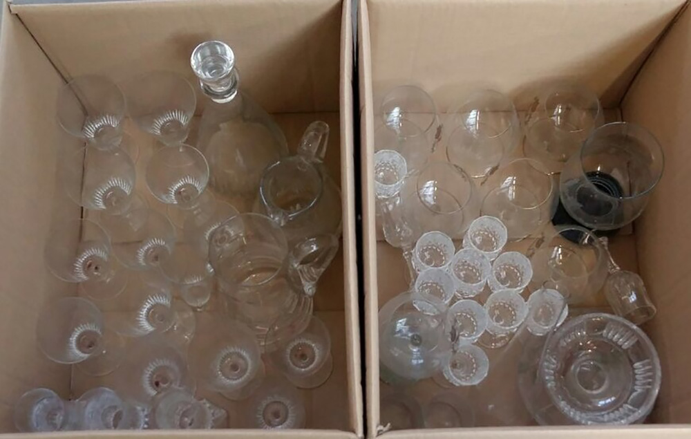 Lotto di due cartoni contenenti numerosi bicchieri e oggetti in vetro (difetti)