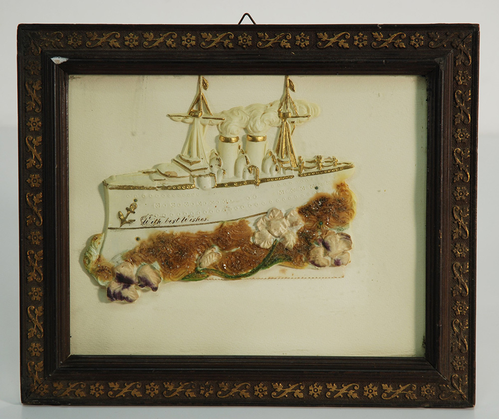 Biglietto d'auguri a forma di barca in rilievo, inizio sec. XX. In cornice