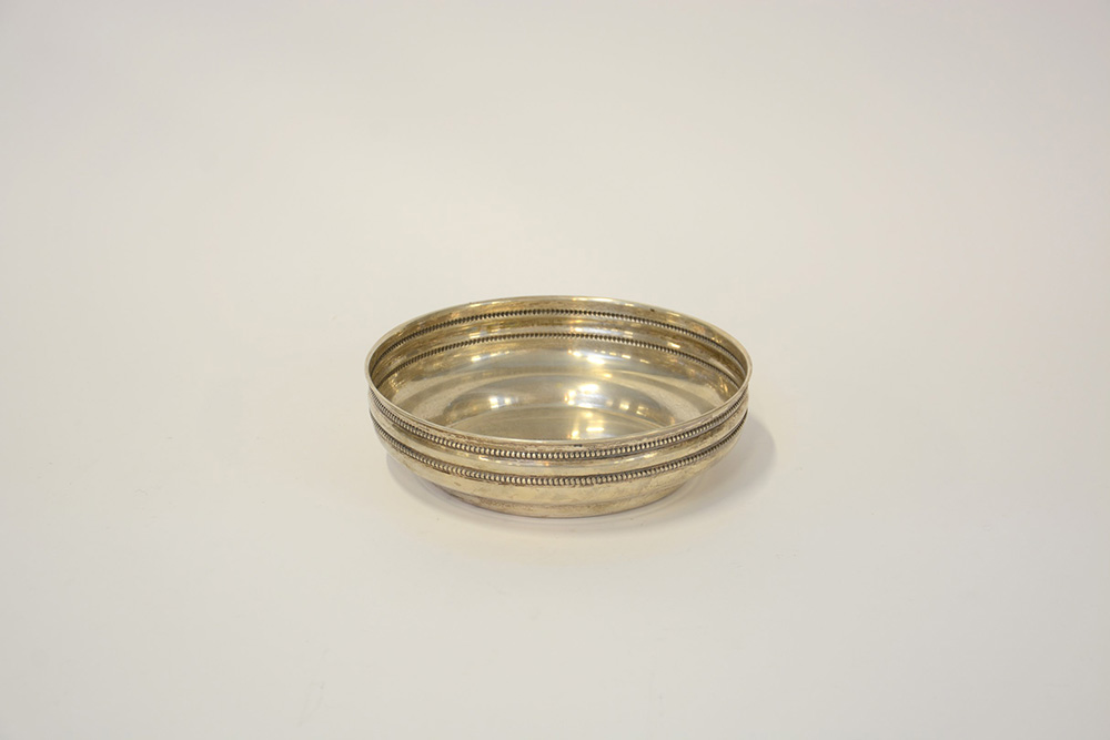 Centrotavola in argento con bordo decorato a perline, gr 195 (d cm 19) (lievi...