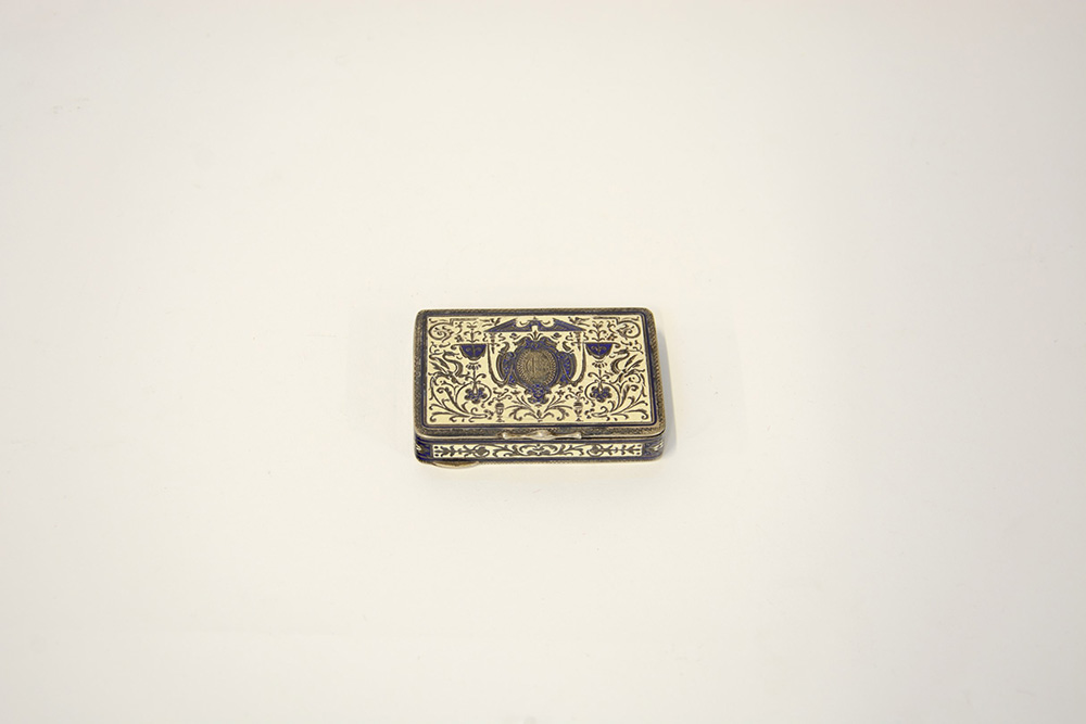 Porta sigarette in argento inciso e decorato a smalti blu e bianco, coperchio monogrammato; inizio secolo XX, gr 100 (difetti)