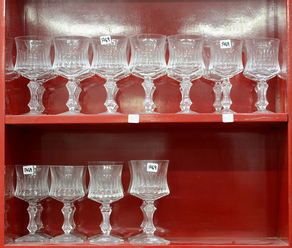 Servizio di calici in cristallo sfaccettato con base esagonale composto da dodici bicchieri per l’acqua e dieci per il vino (lievi difetti)
