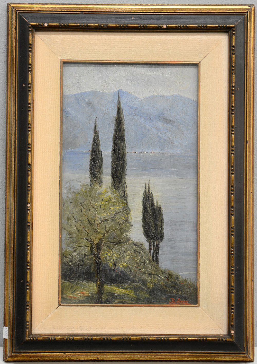 Firma indecifrata "Paesaggio lacustre" olio su cartone pressato (cm 33x20) firmato in basso a destra, in cornice