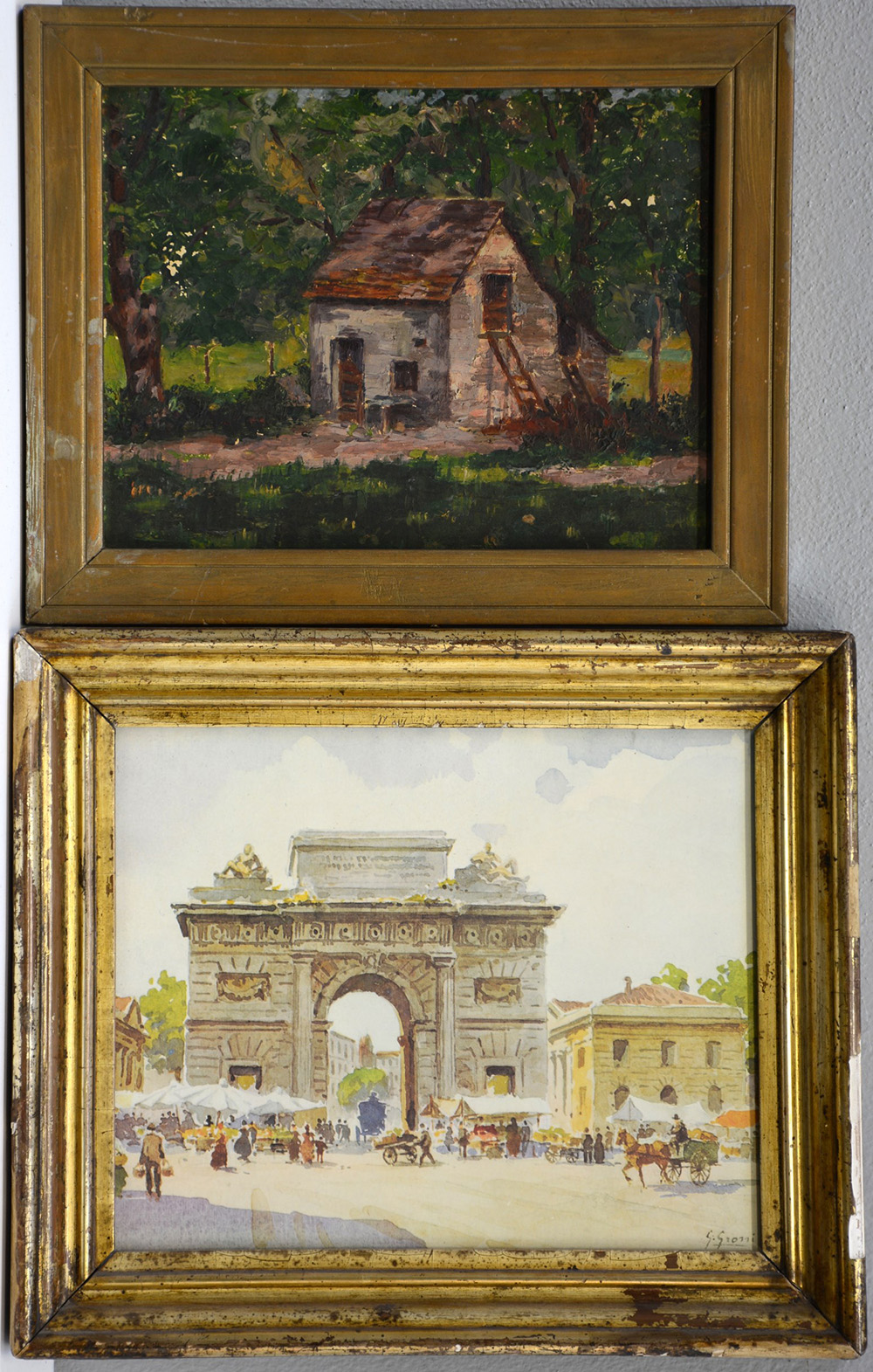 Lotto composto da un dipinto ad olio su cartone raffigurante cascina nel...