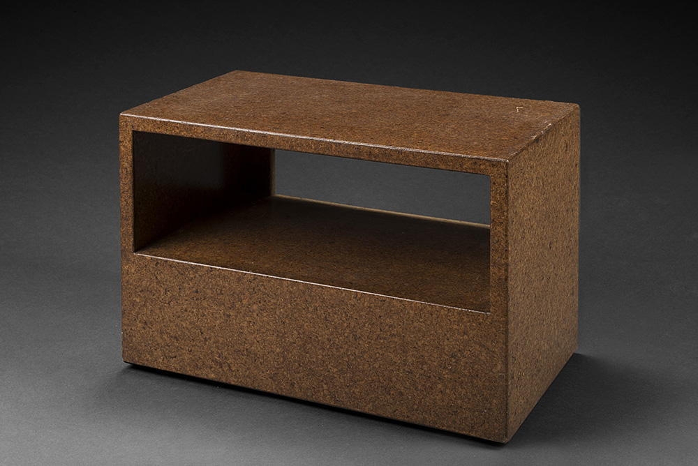 Mobile porta televisore con vano a giorno rivestito in sughero, munito di rotelle. Italia anni 70 (cm 54x36x30) (difetti)