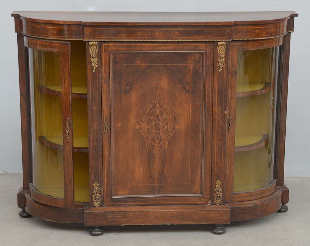 Credenza di forma sagomata a tre ante decorata con fregi e profili in metallo dorato. Piedi torniti. Fine sec. XIX (cm 137x102x37)