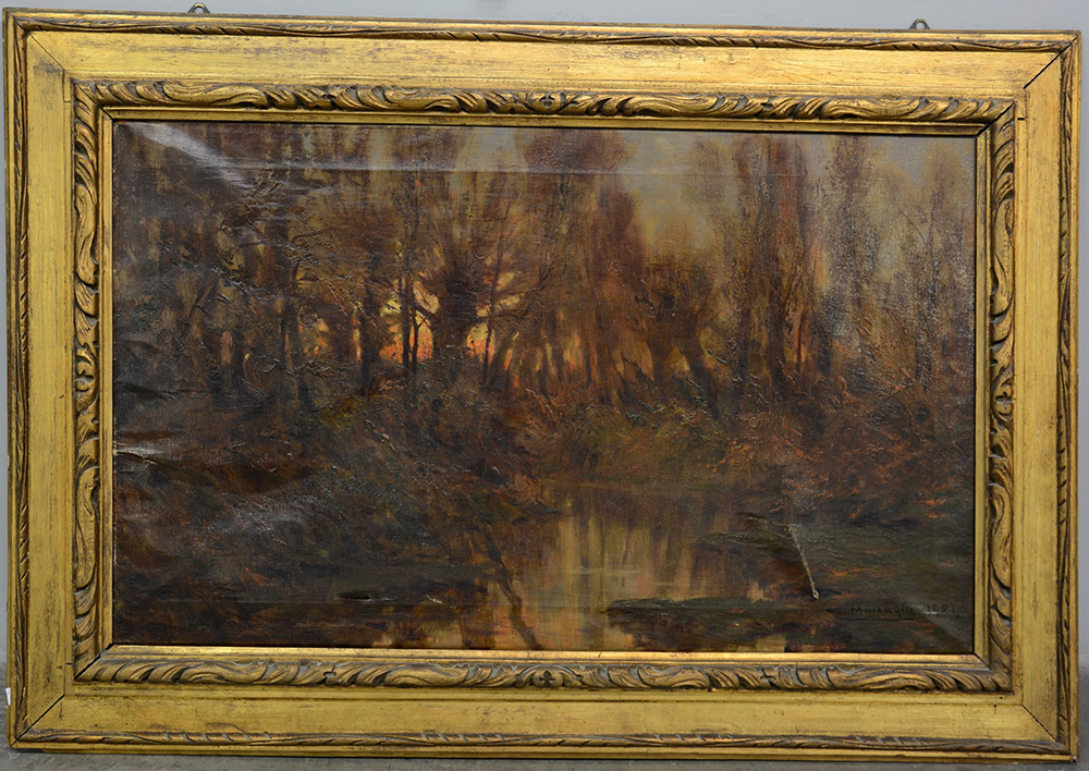 "Paesaggio 1924" olio su tela (cm 70x115) firmato e datato in basso a destra; in cornice dorata (gravi difetti)