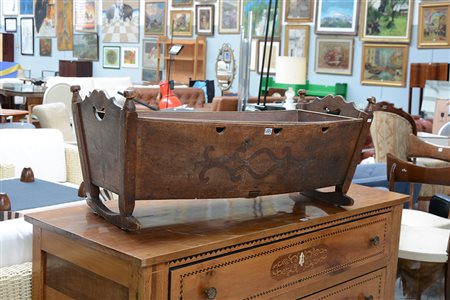 Antica culla in legno completa di vasca portafiori in rame (cm 88x39x38) (difetti)