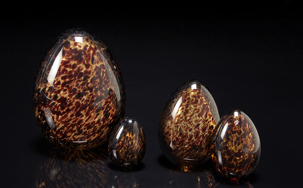 Gruppo di quattro uova in vetro a macchie brune. Sec. XX (misure diverse)