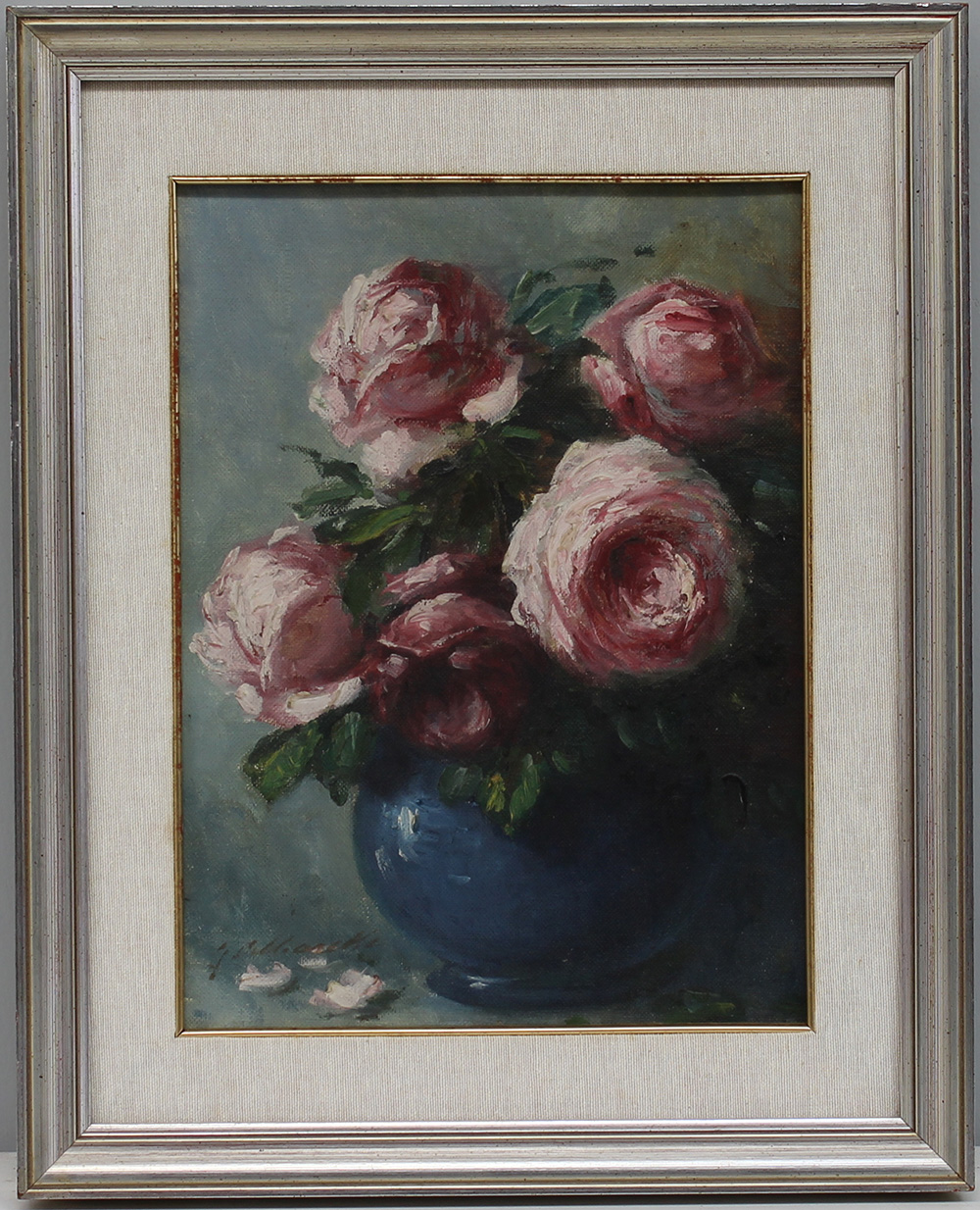 Firma indecifrata, "Vaso con rose" olio di tela (cm 36x26) firmato in basso a sinistra, in cornice (lievi difetti)