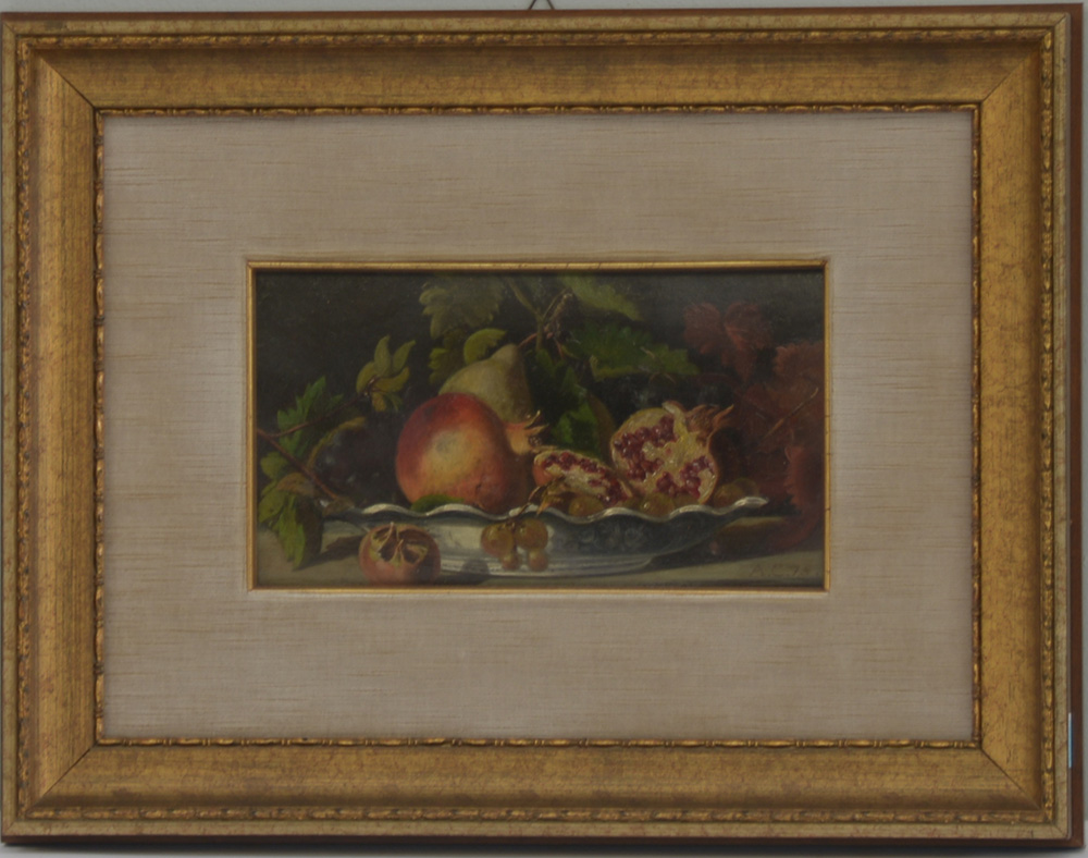 Maestro del XIX secolo "Vaso con frutta" olio su tavola (cm 13x26) Siglato e datato A.C. '75 in basso a destra. In cornice