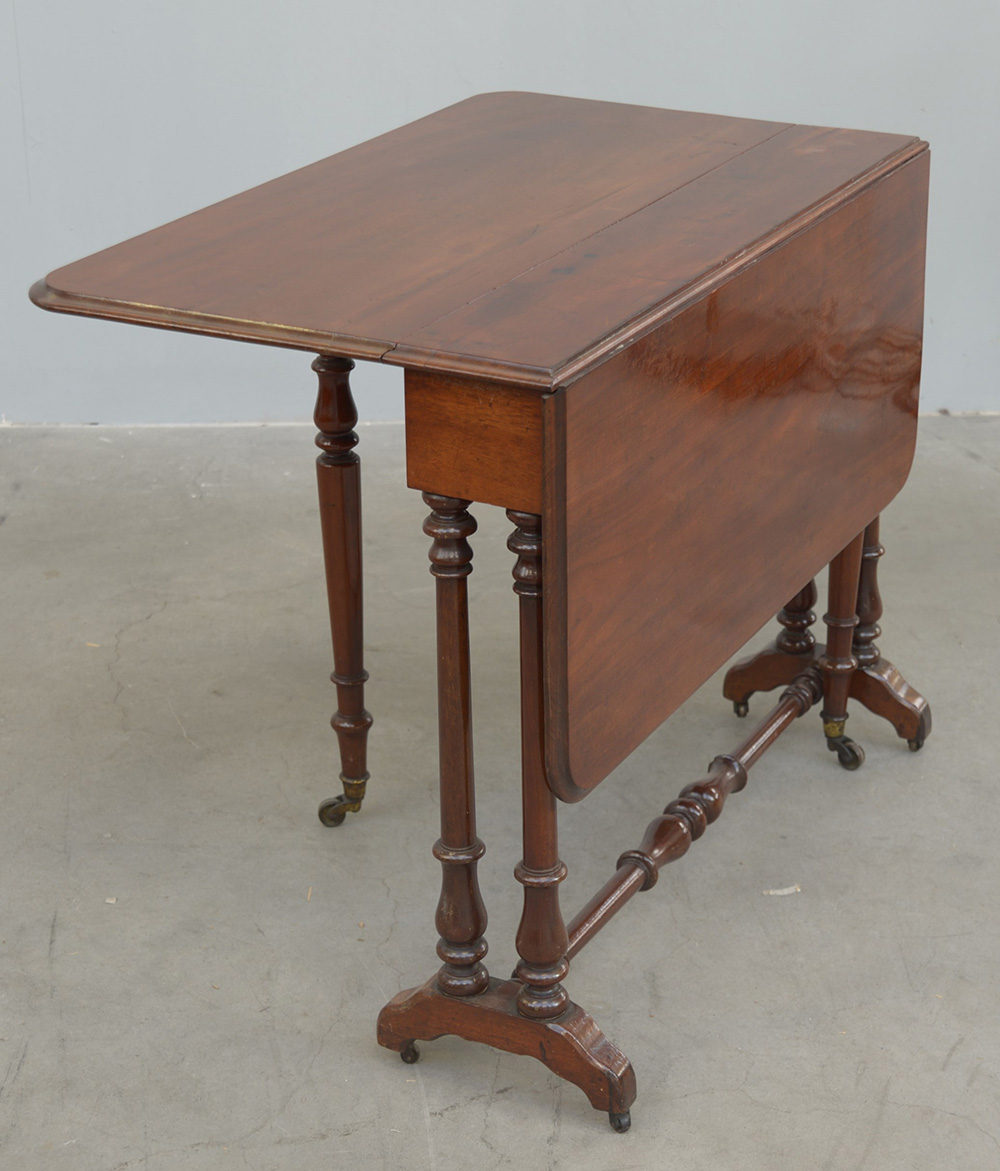 Tavolino ad alette con montanti e traverse tornite. Piedi muniti di rotelle....