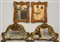 Lotto composto da una coppia di specchierine di forma sagomata in legno dorato e due cornici contenenti riproduzioni (difetti)
