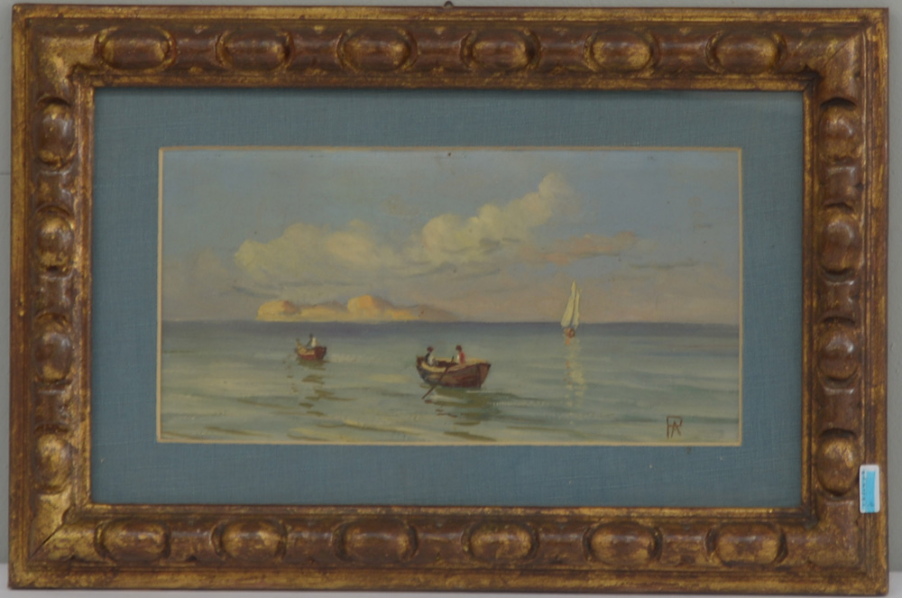 Scuola del sec. XIX "Marina con pescatori" olio su compensato (cm 14x27) Siglato P.A. in basso a destra. In cornice