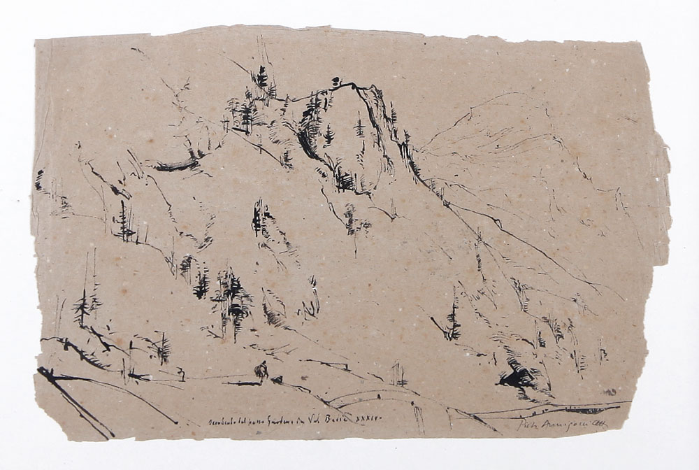 PIETRO ANNIGONI Milano 07/06/1910 - Firenze 1988 Val Badia, 1934 china su carta cm. 25x38,5; firma in basso a destra, titolo e anno in basso al centro, dichiarazione d'autenticità dell'artista su foto, pubblicato sul catalogo della mostra "Annigoni" tenutasi presso la Sala Mostre Ex Fanesi (Falconara Marittima) dal 7 luglio al 19 agosto 2001, pagina 60.