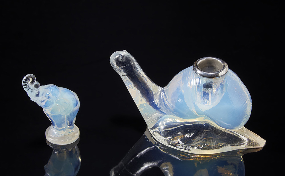 Lotto composto da una sculturina in vetro opalescente soffiato in stampo e molato raffigurante un elefante firmato e locato alla base, unito a un porta candela a forma di lumaca in vetro opalescente soffiato in stampo (difetti e mancanze)