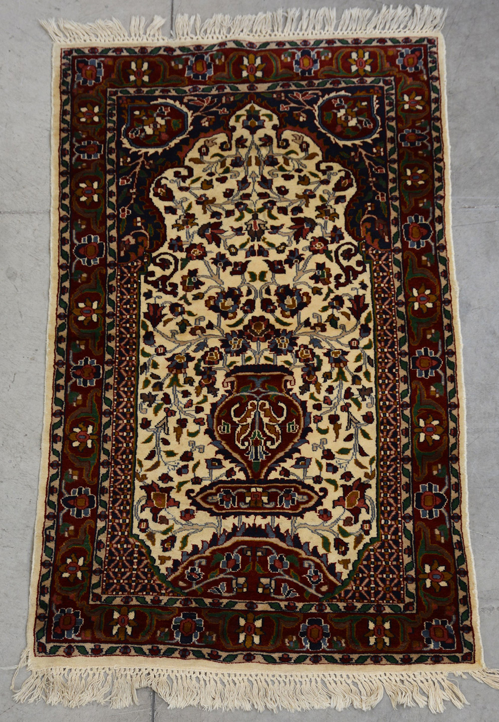 [Tappeti] Tappeto Preghiera Cachemire, India, secolo XX. Mirab a fondo bianco...