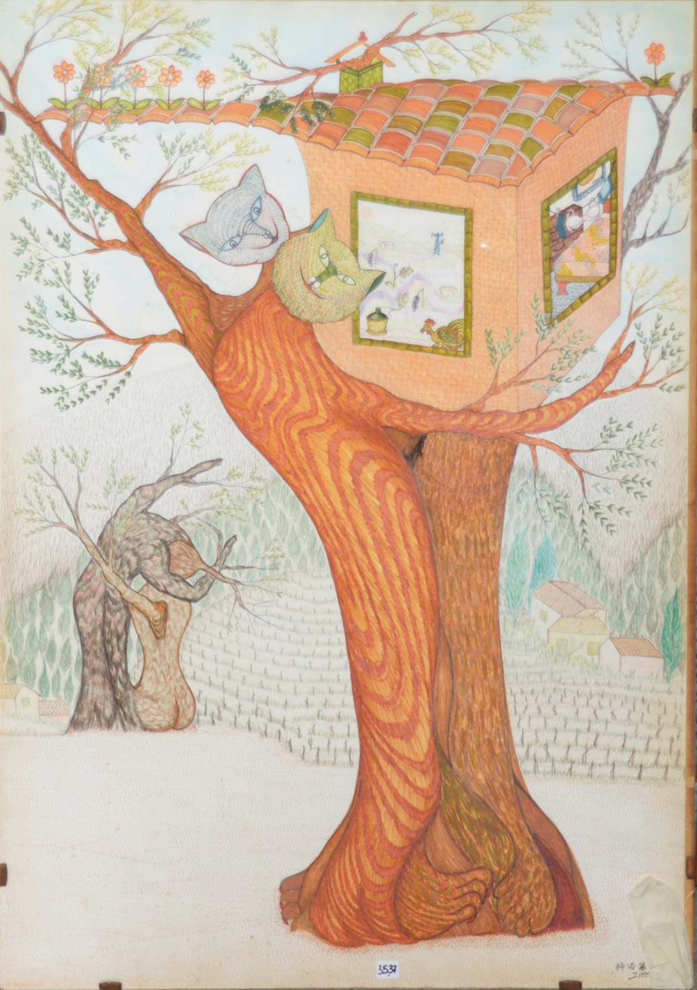 Ignoto "Gatti" 1971, tecnica mista su carta (cm 100x70). Firma indecifrata, datato 1971 e inscritto a ideogrammi in basso a destra