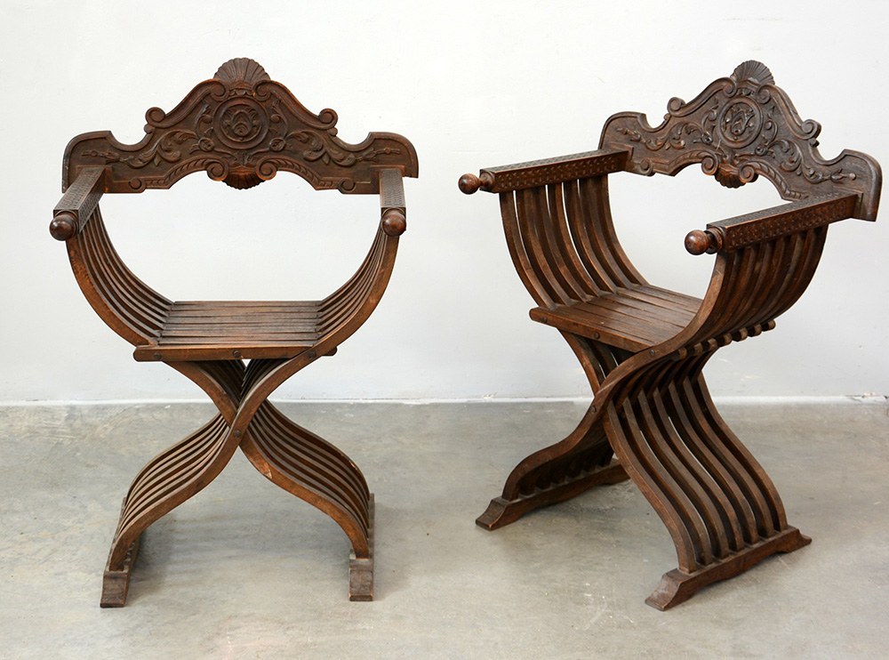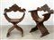 Coppia di sedie Savonarola con schienale intagliato a motivi vegetali (h cm 93) (difetti e mancanze)