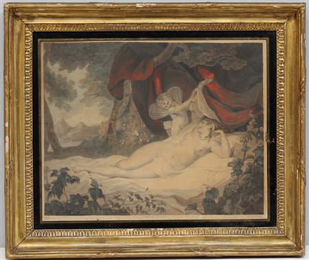 Antica incisione acquerellata raffigurante Venere e Cupido (cm 33x41), in...