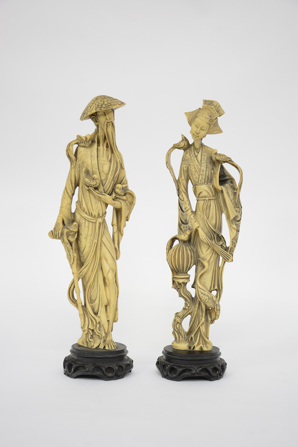 Coppia di sculture di materiale plastico raffigurante personaggi orientali (h...